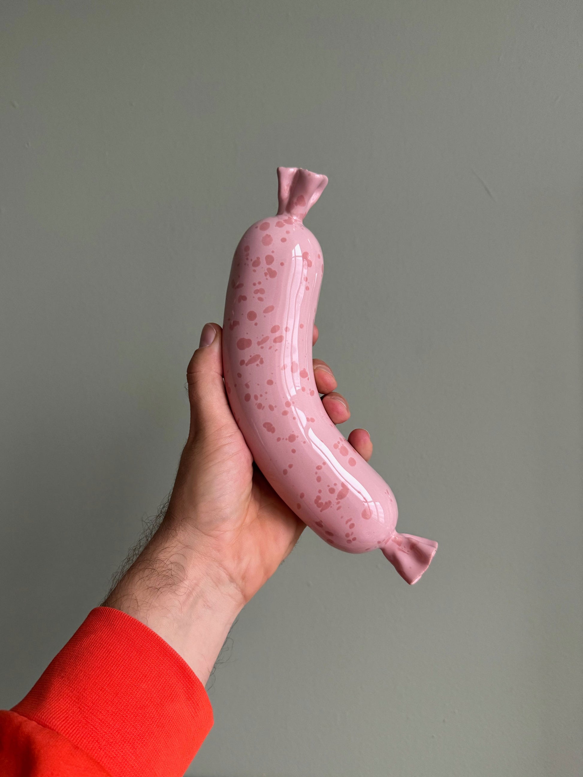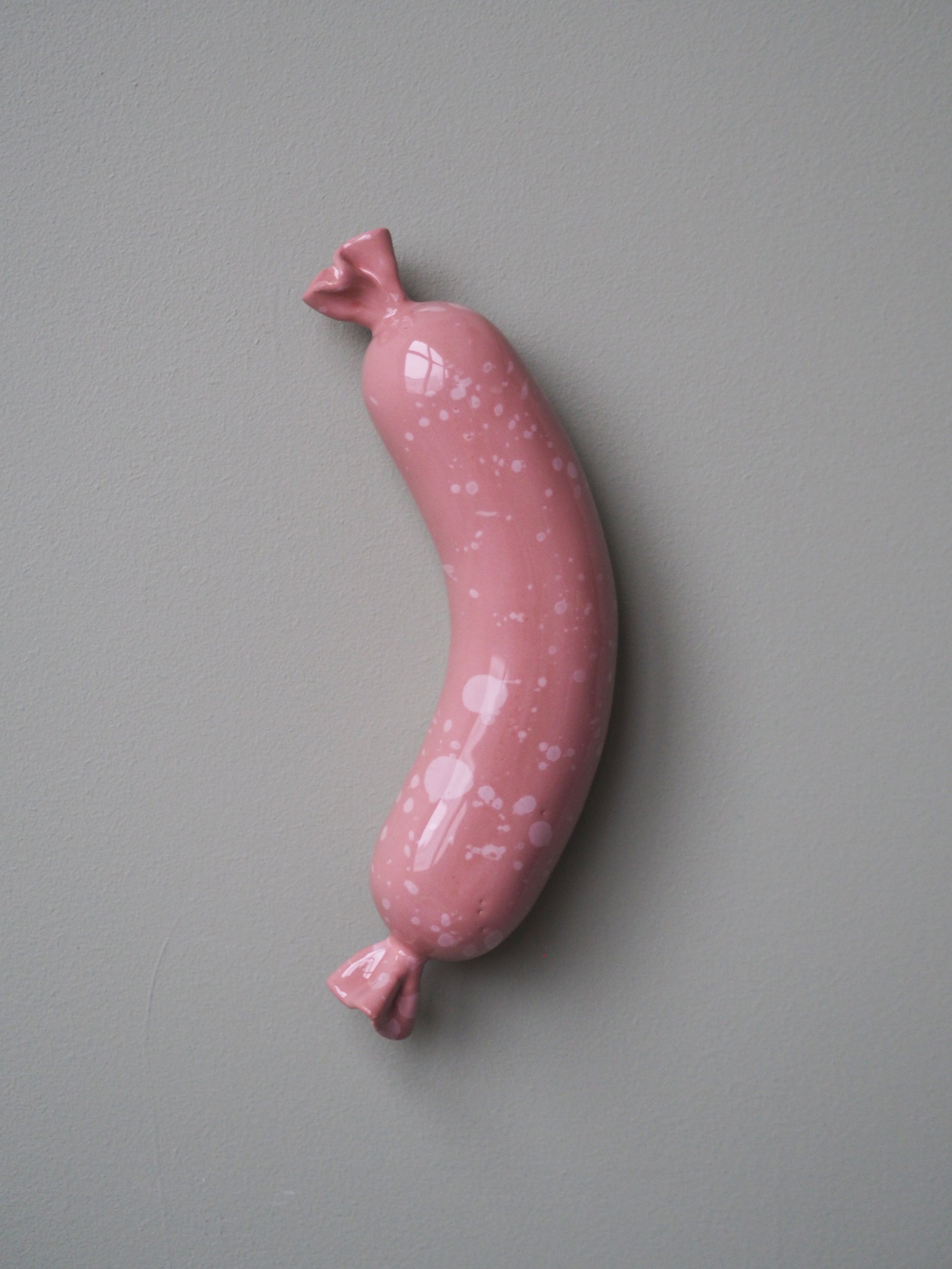 Wall Sausage -sarja alkoi vuonna 2021 Ceramic Deli -näyttelystäni. Ihmiset nimesivät vaaleanpunaisia maljakoitani nakkivaasiksi ja tästä inspiroituneena päätin jatkaa makkarateeman kanssa. Pidän todella siitä, että voin muokata tätä hyvin universaalia muotoa monin eri tavoin - se voi olla makkara sinapilla, suolakurkku tai jopa keltainen hymynaama. Esineen takana on kaksi reikää, joten veistoksen voi helposti ripustettua joko vaakaan tai pystyyn.