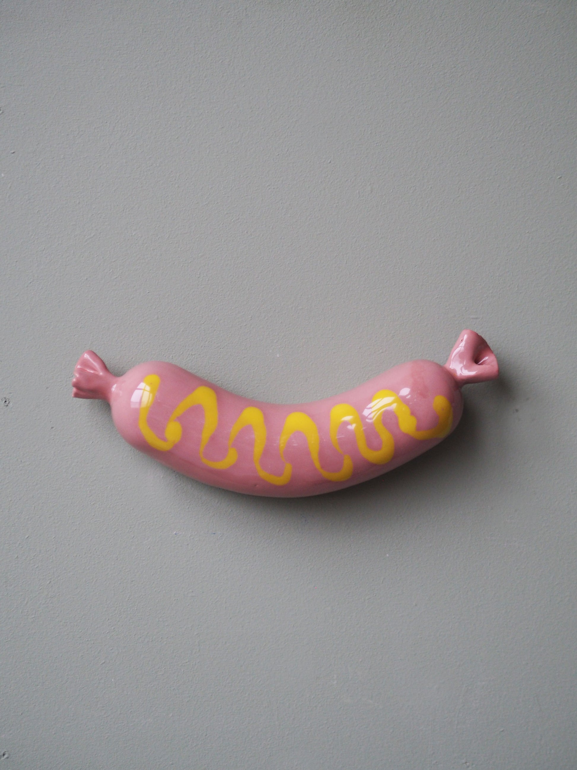 Wall Sausage -sarja alkoi vuonna 2021 Ceramic Deli -näyttelystäni. Ihmiset nimesivät vaaleanpunaisia maljakoitani nakkivaasiksi ja tästä inspiroituneena päätin jatkaa makkarateeman kanssa. Pidän todella siitä, että voin muokata tätä hyvin universaalia muotoa monin eri tavoin - se voi olla makkara sinapilla, suolakurkku tai jopa keltainen hymynaama. Esineen takana on kaksi reikää, joten veistoksen voi helposti ripustettua joko vaakaan tai pystyyn.