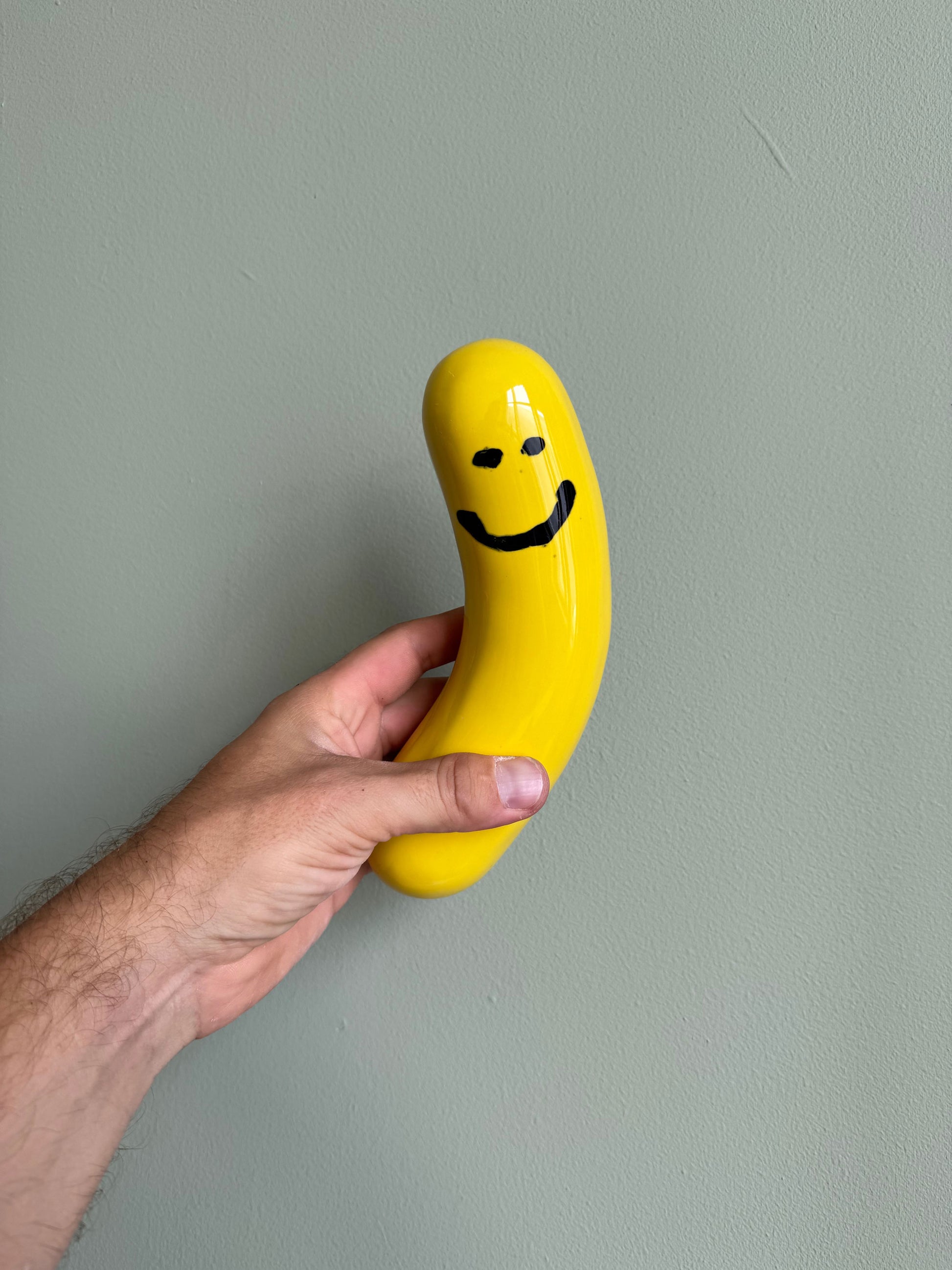 Wall Sausage -sarja alkoi vuonna 2021 Ceramic Deli -näyttelystäni. Ihmiset nimesivät vaaleanpunaisia maljakoitani nakkivaasiksi ja tästä inspiroituneena päätin jatkaa makkarateeman kanssa. Pidän todella siitä, että voin muokata tätä hyvin universaalia muotoa monin eri tavoin - se voi olla makkara sinapilla, suolakurkku tai jopa keltainen hymynaama. Esineen takana on kaksi reikää, joten veistoksen voi helposti ripustettua joko vaakaan tai pystyyn.