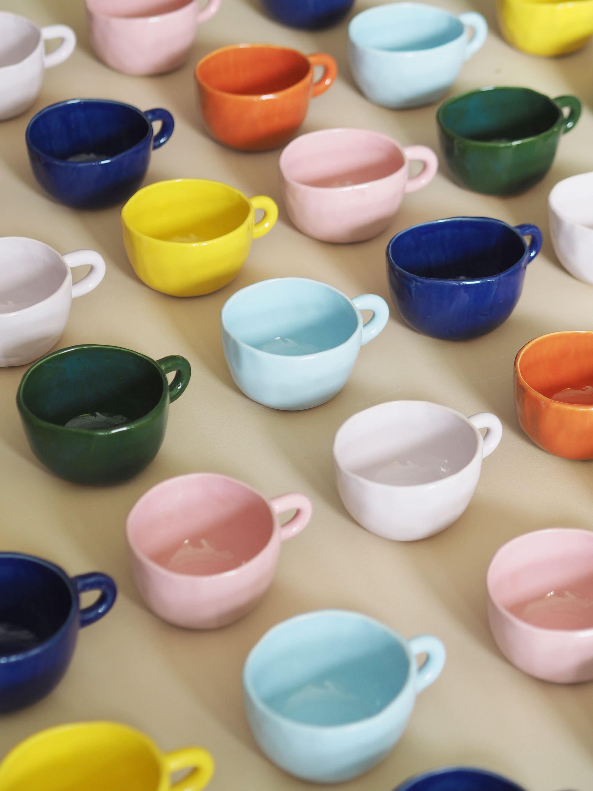 Wonky was originally created in collaboration with the BobW hotel, when we made cups for all 90 rooms of their flagship location. Inspired by the spirit of the 1970s, I wanted the cups to have a plump shape, a round handle, and cheerful colors – pieces that bring a smile to your face before the very first sip.